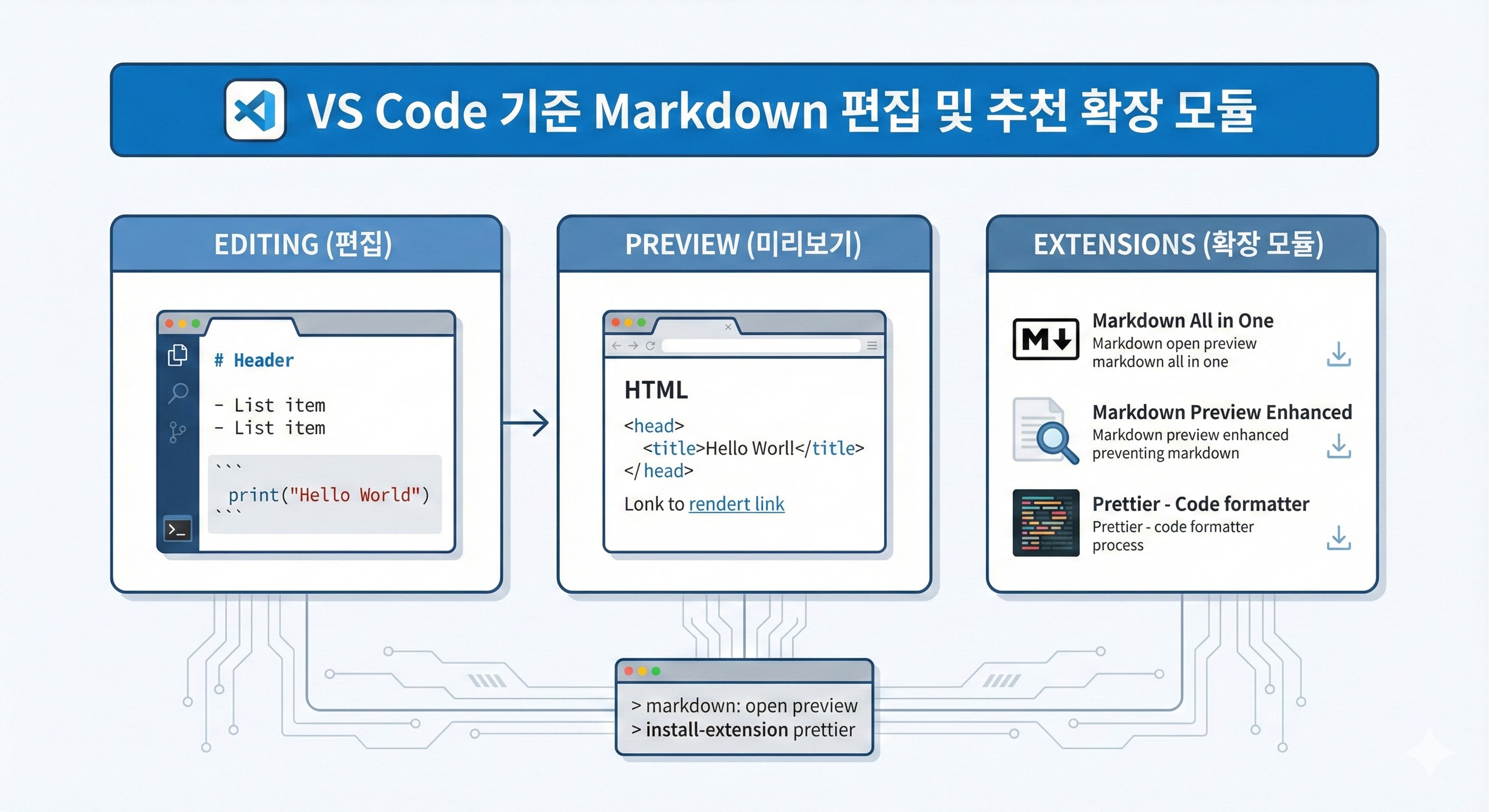 VS Code 기본 기능만으로도 Markdown 파일 열기, 편집, 코드 블록 미리보기 가능.